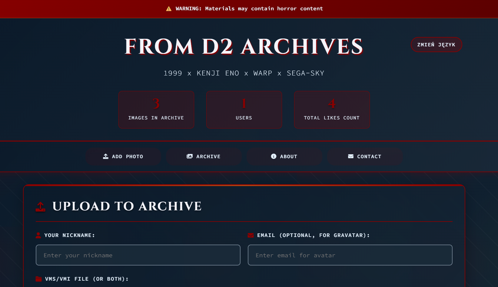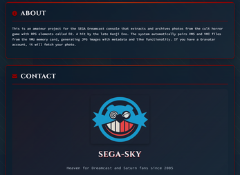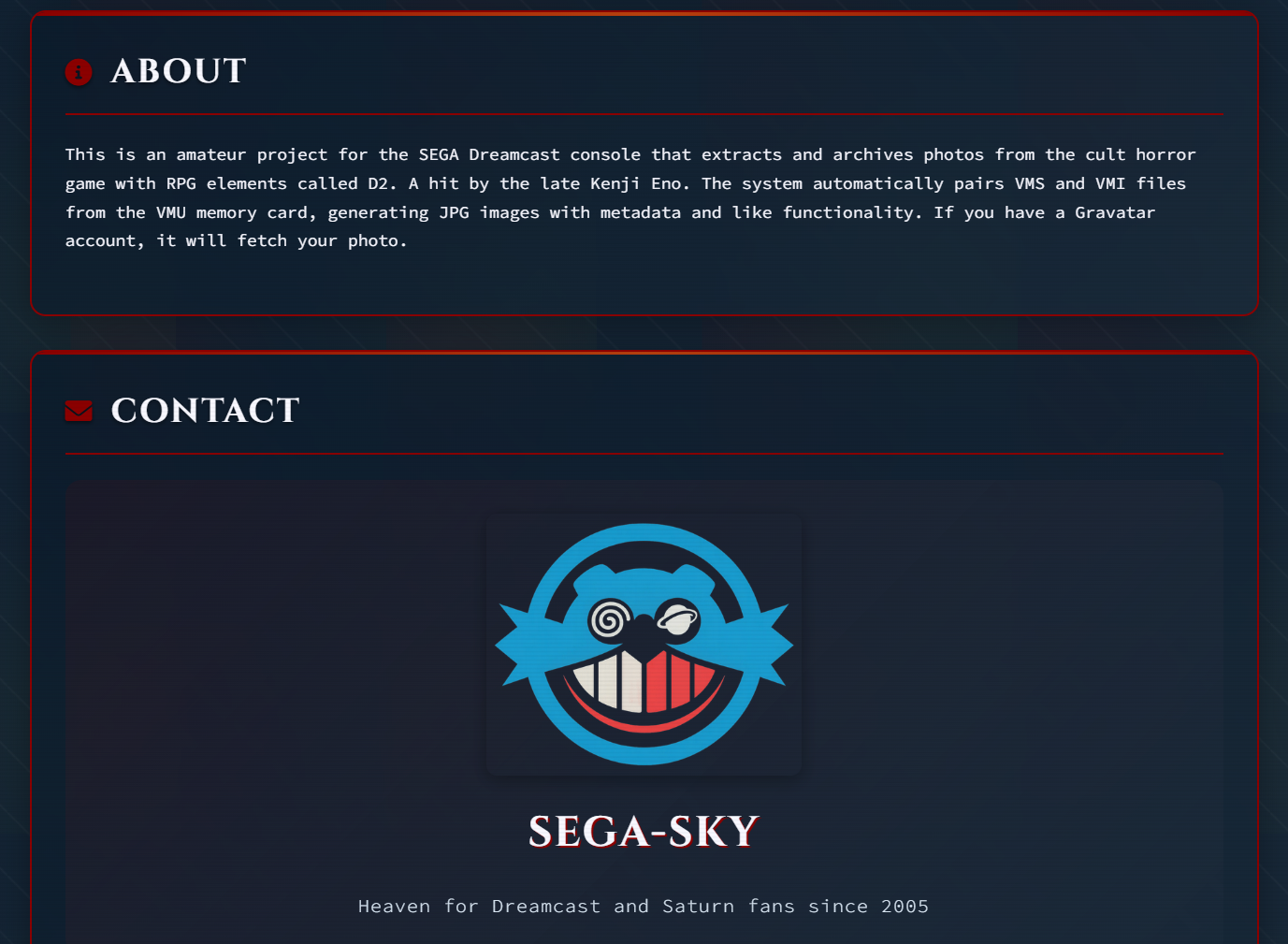 🧬 Simply upload D2 photo VMS save file from your Dreamcast memory card, and the site automatically extracts and displays every photo it contains. These snapshots often carry a deeply personal connection—dramatic scenes, eerie discoveries, or quiet moments you decided were worth preserving. Now you can rediscover them with modern convenience and clarity.